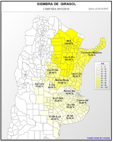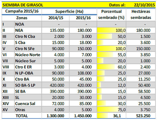 La fluida incorporación de cuadros de girasol sobre el Norte de La Pampa-Oeste de Buenos Aires, Centro de Buenos Aires, Sudoeste de Buenos Aires-Sur de La Pampa y Sudeste de Buenos Aires, permitió alcanzar un progreso intersemanal de 6,8 puntos porcentuales y elevar la siembra a nivel nacional al 36,1 % de la superficie aún proyectada en 1.450.000 hectáreas. Al presente informe el retraso interanual en la siembra es de –4,4 puntos porcentuales, y en números absolutos ya se ha logrado implantar más de 520.000 hectáreas.