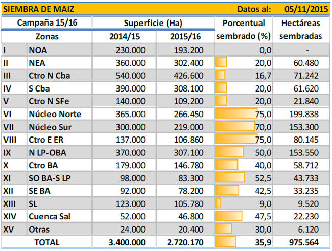 Esta decisión va cobrando fuerza tanto por la evolución climática durante octubre, como por la evolución de los precios futuros del cereal, que determinaran los rindes de indiferencia a presupuestar. Frente a este panorama se afianzan las posibilidades de alcanzar un área sembrada de 2.720.000 Ha, cifra que permite calcular una baja tentativa de un -20 % en comparación al ciclo previo (Campaña 2014/15: 3,4 MHa). Sobre esta estimación de superficie, el avance de siembra cubrió a la fecha el 35,9 % del área y la variación intersemanal se ubicó en los 2,5 puntos porcentuales.