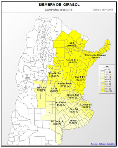 Las precipitaciones acumuladas en las últimas semanas permitieron lograr una condición de humedad óptima para la incorporación de nuevos cuadros de girasol en gran parte del centro y sur del área agrícola. De todas maneras, las bajas temperaturas registradas en el suelo continúan demorando las labores de siembra, registrando un progreso en la implantación a nivel nacional del 49,9 % del área proyectada en 1.450.000 hectáreas (Campaña 14/15: 1,3 MHa).