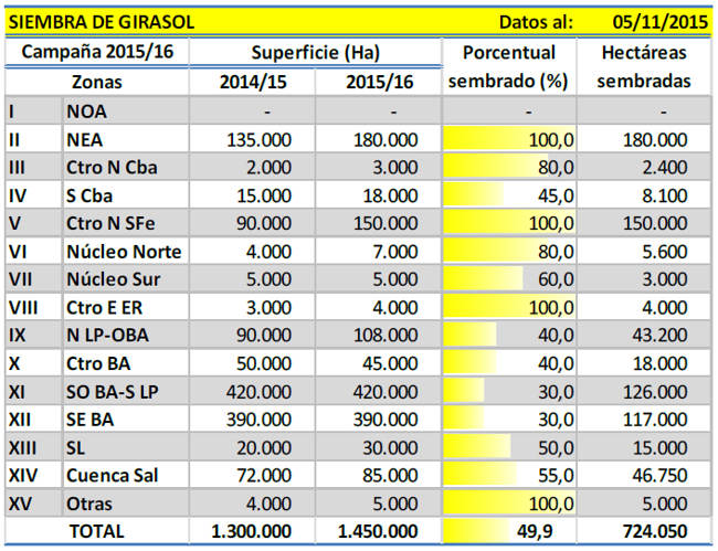 En números absolutos ya se han incorporado más de 720.000 hectáreas en todo el país y el avance intersemanal es de 8,7 puntos porcentuales y el retraso en la siembra en comparación al ciclo previo de -12,1 puntos. Restando un mes para finalizar las labores de siembra y no se descarta la posibilidad de incrementar el área a implantar con girasol durante la campaña en curso.