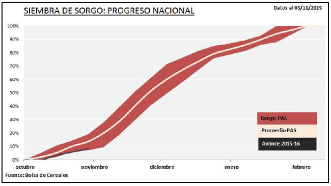 Los mayores progresos de siembra se han dado sobre las regiones Núcleo Sur y Norte, el Centro-Norte de Santa Fe y el Centro Este de Entre Ríos. La campaña en general ha iniciado con retrasos a causa de las bajas temperaturas registradas al inicio de la primavera y la falta de humedad superficial, que impedían asegurar un correcto establecimiento del cultivo. Esta situación se ha revertido en las últimas semanas permitiendo que la siembra se agilice. Del mismo modo, se relevaron progresos incipientes en la siembra de sorgo en regiones tales como el oeste bonaerense, la provincia de La Pampa, Sur de Córdoba, Centro-Norte de Córdoba y el NEA.