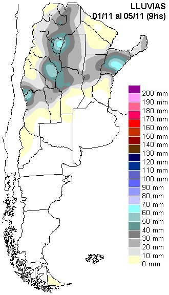 Las lluvias que se grafican en el mapa corresponden a las que se han observado en estos primeros días de noviembre. Las mismas presentan un inusual despliegue sobre el sur del NOA, sobre las provincias semiáridas, la región cuyana y el oeste de la franja mediterránea. Desde allí las precipitaciones se desprenden en un corredor hacia el centro de la Mesopotamia, sector que en octubre fue el único que con seriedad podría decirse que tuvo un efecto Niño, con acumulados que superaron los 300 milímetros.