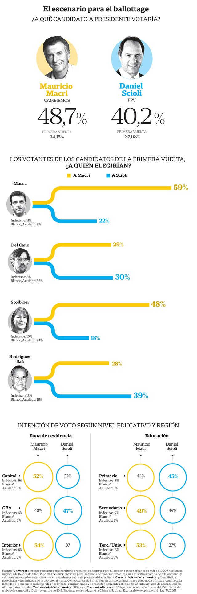 El detalle indica que Macri tiene una intención de voto de 48,7 por ciento y Scioli, de 40,2 por ciento. El margen de error de la encuesta es de 3,5 puntos, para un nivel de confianza de 95%.