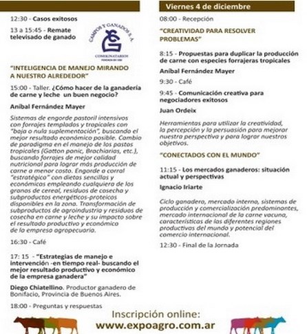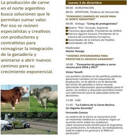 Jueves 3 y viernes 4 de diciembre en el Hotel Termas Rosario de la Frontera, Salta. Además el jueves 3 habrá un remate televisado, organizado por la consignataria Campos y Ganados S.A., Hotel Termas de Rosario de la Frontera Cámara Argentina de Contratistas Forrajeros, Aapresid, Movimiento CREA, Confederaciones Rurales Argentinas, Prensa Cámara Argentina de Feedlot.