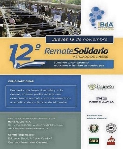 La Red Argentina de Bancos de Alimentos (RedBdA), que agrupa a 16 Bancos de Alimentos (BdA) en todo el país, llevará a cabo el 12° Remate Solidario de Hacienda conjuntamente con el Banco de Alimentos de Tandil y con el apoyo de la consignataria de hacienda Martín G. Lalor S.A. Tendrá lugar el jueves 19 de noviembre a las 08 hs. en el Mercado de Hacienda de Liniers.