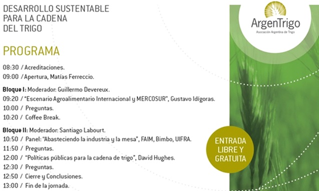 El próximo miércoles 25 de noviembre Argentrigo realiza la Jornada de Desarrollo Sustentable para la Cadena del Trigo, en el Salón de la Bolsa de Cereales de Buenos Aires, Bouchard 454 PB CABA. El horario de es 8.30 a 13 horas.