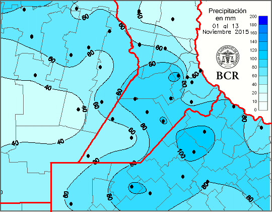 En la zona núcleo las medias estadísticas de noviembre, tomando el período que va de 1970 a 2014, indican promedios en torno a los 100 y 110 mm. Hasta la semana pasada, como se observa en los gráficos de los acumulados del 1ro al 13 de noviembre, las lluvias, en general estuvieron entre los 60 y los 80 mm. En muchas localidades, con las lluvias moderadas que se esperan esta semana, los acumulados ya se acercarían a los esperados para el final del mes.