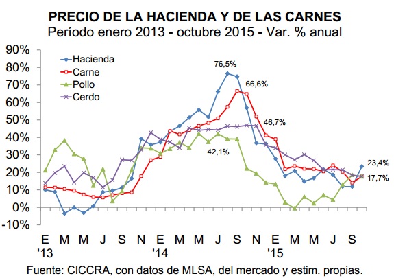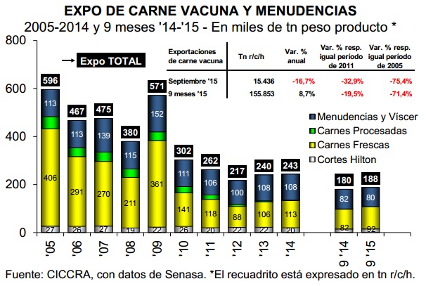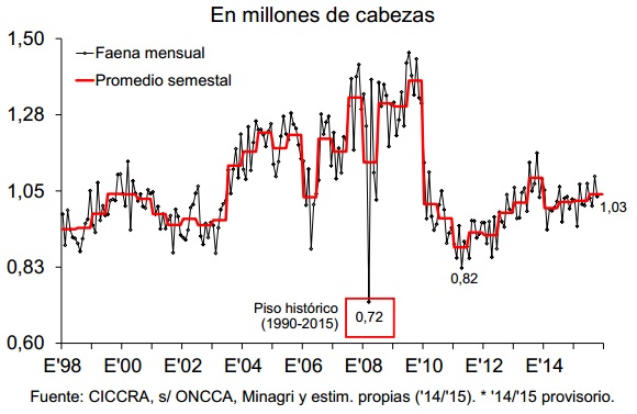 En los primeros diez meses de 2015 la producción de carne vacuna fue de 2,3 millones de tn r/c/h y resultó 3,6% mayor a la observada en enero-octubre de 2014. Esto implica que la cantidad ofertada se expandió en 81,0 mil tn r/ch en términos interanuales.