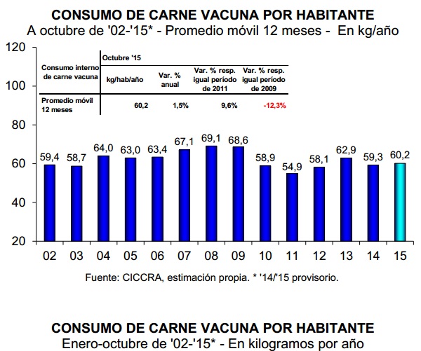 El promedio móvil (últimos doce meses) se ubicó en 60,2 kilogramos/año en octubre de 2015 y resultó 1,5% superior al nivel registrado en igual mes de 2014.