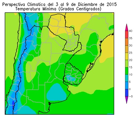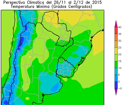 Sólo el oeste del Paraguay y el oeste de Formosa observarán temperaturas mínimas superiores a 20°C. El sudeste del Paraguay, el este del NOA; la mayor parte de la Región del Chaco, el norte de la Mesopotamia, el norte de Córdoba y el norte de Cuyo, observarán temperaturas mínimas superiores a 15°C. El centro del NOA, el centro y el sur de la Mesopotamia, la mayor parte de la Región de Cuyo, la mayor parte de la Región Pampeana y la mayor parte del Uruguay observarán temperaturas mínimas entre 10 y 15 ºC.
