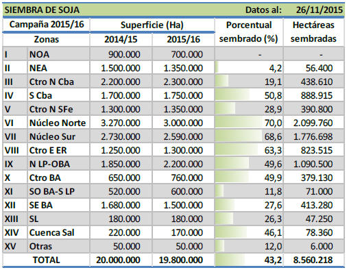 Sobre el centro y sur del área agrícola, la mayor parte del área sembrada en fechas tempranas se encuentra diferenciando hojas en muy buenas condiciones. En sectores de Santa Fe, Córdoba y Entre Ríos se registraron pérdidas por granizo, y muchos de los cuadros afectados deberán ser resembrados. Por otra parte durante los últimos días se han agravado los excesos hídricos en diferentes sectores del Núcleo Norte y Sur, y este factor no solo limita la circulación de maquinarias debido a la falta de piso, sino que de perdurar esta situación durante las próximas semanas podría incluso restringir el área sembrada en ambas regiones. Finalmente se han comenzado a registrar las primeras siembras de segunda, fundamentalmente sobre rastrojos de trigo en sectores del Centro-Norte de Córdoba y Santa Fe. Se prevé que durante las próximas semanas, a medida que avance la cosecha de trigo sobre el centro de la región agrícola, la siembra de soja de segunda cobre un impulso sostenido por una buena oferta hídrica en superficie.