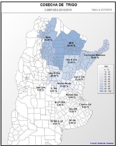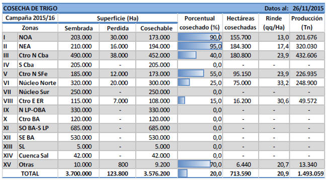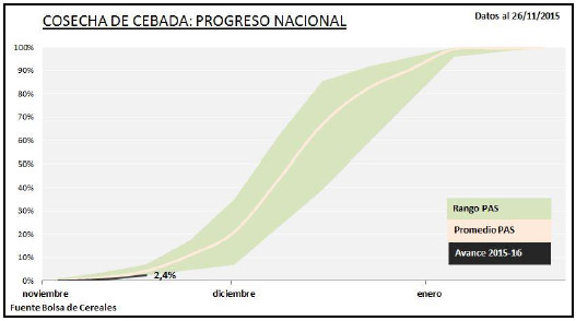 Se espera que la cosecha cobre fluidez sobre la provincia de Buenos Aires hacia mediados del mes de Diciembre, reflejando algún retraso en comparación a ciclos previos. De no mediar adversidades durante el próximo mes, la cosecha de la campaña 2015/16 podría alcanzar un volumen de 3.650.000 toneladas, ubicándose un 28 % por encima de lo cosechado en el ciclo previo (Campaña 2014/15: 2.850.000 Tn).