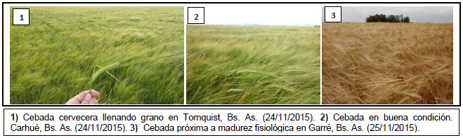 Sobre los núcleos cebaderos, ubicados sobre el Sur de la provincia de Buenos Aires, la mayoría de los cuadros se encuentran en grano lechoso o pastoso en condiciones favorables de desarrollo. Gracias a las temperaturas moderadas y la disponibilidad hídrica se espera que los cuadros de cebada rindan por encima de los valores promedio históricos de las diferentes zonas. Sobre este sector, si bien las heladas han acotado el potencial de rendimiento, aún se espera que la cosecha entregue buenos rendimientos gracias a la disponibilidad hídrica y a la ausencia de plagas y enfermedades generalizadas sobre el cultivo.