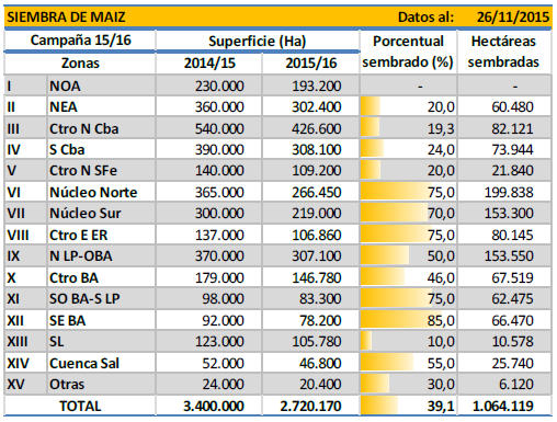 Durante la última semana continuó la siembra de cuadros de maíz con destino grano comercial correspondiente a la campaña 2015/16. Las tareas de siembra se vincularon a la incorporación de los últimos lotes tempranos en el sur del área agrícola nacional. La caída de granizo registrada en parte de las provincias de Córdoba, Santa Fé y Entre Ríos generó pérdidas de cuadros. A la fecha no hay certeza en cuanto al número de lotes con daños parciales o severos. A medida que nos acercamos al comienzo de la ventana de siembra de maíces tardíos en el centro del país, se continúa relevando la tendencia hacia un aumento del área destinada a estos planteos. Frente a este panorama mantenemos la intención de siembra inicial en 2.720.000 Ha para la campaña 2015/16, un - 20 % en comparación al ciclo previo (Campaña 2014/15: 3,4 MHa). Sobre esta estimación de superficie, el avance de siembra cubrió a la fecha el 39,1 % del área y la variación intersemanal se ubicó en 2 puntos porcentuales.
