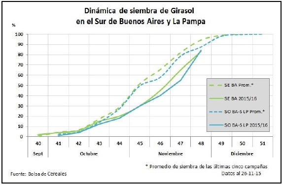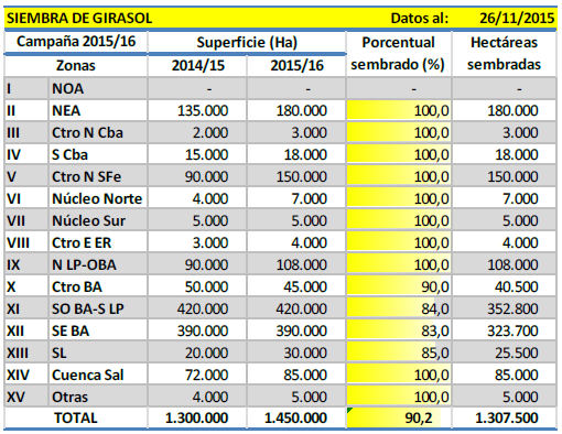 Durante la última semana, las labores de incorporación de nuevos cuadros de girasol se extendieron principalmente sobre el centro y sur de Buenos Aires, donde se concentra gran parte de la superficie nacional y restan pocos días para que finalice la ventana óptima de siembra. Las buenas condiciones climáticas permitieron agilizar la implantación de la oleaginosa en las regiones Norte de La Pampa-Oeste de Buenos Aires, Centro de Buenos Aires, Sudoeste de Buenos Aires-Sur de La Pampa y Sudeste de Buenos Aires. Al presente informe se registra un progreso en la implantación del 90,2 % de la superficie aún proyectada en 1.450.000 hectáreas (Campaña 14/15: 1,3 MHa). En números absolutos ya se han incorporado más de 1.300.000 hectáreas, permitiendo calcular un avance intersemanal de 16,1 puntos porcentuales y un retraso en la siembra en comparación al ciclo previo de -6,7 puntos.