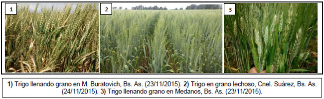 Por último, en las regiones Sudeste de Buenos Aires y Sudoeste de Buenos Aires-Sur de La Pampa el estado del cultivo es muy bueno, aunque el nivel tecnológico aplicado es bajo. Los cuadros incorporados en fechas tempranas ya se encuentran en grano pastoso, mientras que los más atrasados están comenzando con el llenado de grano. El estado sanitario es bueno, aunque se relevó presencia de roya y mancha amarilla en gran parte de la región.