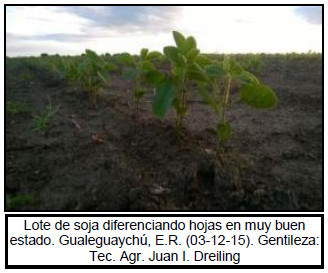 Hacia la zona Centro-Norte de Santa Fé, más del 50 % de los cuadros se encuentran en floración; ya relevándose los primeros lotes en principios de llenado de grano. Las últimas tormentas dejaron como principal problema los anegamientos en sectores planos del terreno. Los mismos comienzan a afectar a los cultivos ya implantados y dificultarían las tareas de siembra de los cuadros tardíos. Hacia la región Centro-Este de Entre Ríos los cuadros se encuentran transitando estadíos vegetativos (V10) y floración. El estado hídrico es bueno y se están culminando las refertilizaciones nitrogenadas.