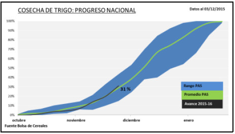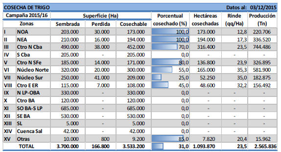 Por otra parte, al presente informe se da por finalizada la cosecha en las regiones NOA y NEA, donde los rindes promedios se ubicaron en los 12,8 qq/Ha y 17,3 qq/ha, respectivamente, permitiendo lograr una producción de 220 mTn y 336 mTn. Para ambos casos, los rindes se ubicaron por encima de los obtenidos en la campaña 2014/15. Sobre el NOA, los últimos cuadros en ser cosechados lograron un rinde inferior al relevado sobre el comienzo de la trilla, como consecuencia de la escasez hídrica prolongada que se ubicó durante el llenado de grano en los cuadros sembrados en fechas más tardías. A su vez, las pérdidas se vieron incrementadas durante la semana pasada a causa del brotado originado en grano luego de las últimas precipitaciones registradas. En el NEA, los rindes fueron muy dispares y se relevaron oscilaciones de rinde entre los 13 y 22 qq/Ha. Los cuadros tempranos se vieron afectados en mayor medida por las heladas ocurridas en el mes de noviembre, que se ubicaron sobre el fin de la etapa de llenado de grano del cereal, y en consecuencia lograron un menor potencial de rendimiento.