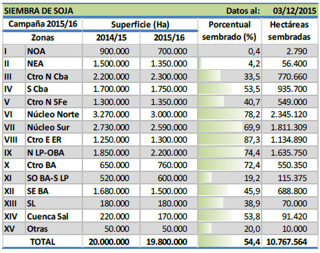 Las zonas que mayor proporción de la siembra local han concretado continúan siendo el Centro-Este de Entre Ríos, el Núcleo Norte y Sur. Sin embargo, las siembras sobre la provincia de Córdoba y Buenos Aires han cobrado fluidez con importantes progresos en los últimos días.