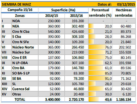 Comenzando la ventana de siembra de maíces tardíos o de segunda ocupación en el centro y sur del país, se reafirma un posible aumento en los cuadros destinados al cereal. Frente a este panorama mantenemos la intención de siembra inicial en 2.720.000 Ha para la campaña 2015/16, un -20 % en comparación al ciclo previo (Campaña 2014/15: 3,4 MHa). Sobre esta estimación de superficie el avance de siembra cubrió a la fecha el 43,6 % del área, en números absolutos unas 1,18 MHa.