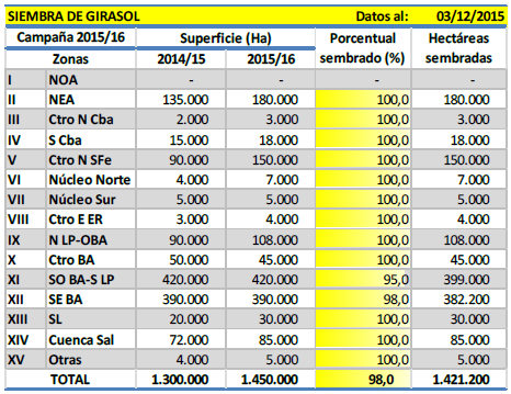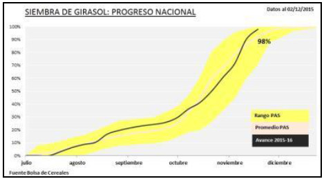 Restando pocos días para que finalice la incorporación de los últimos cuadros de girasol en el país, las buenas condiciones climáticas registradas la semana pasada permitieron elevar el progreso de siembra a nivel nacional al 98 % de la superficie aún proyectada en 1.450.000 hectáreas (Campaña 14/15: 1,3 MHa).