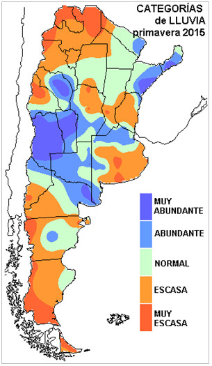 Esto es, uno debería esperar que al promediar las precipitaciones el trimestre sept-nov, se defina un vasto sector con precipitaciones por encima de los valores normales. Este comportamiento se ha hecho presente en forma mucho más irregular que lo que podría esperarse teniendo en cuenta que el evento Niño actual es uno de los más intensos de los últimos 60 años.