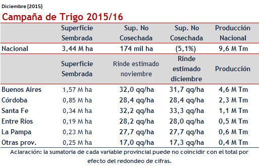 Hubo trabajos de teledetección realizados con Landsat 8 en el corazón triguero, que permiten verificar las estimaciones previas en la importante cuenca de Tres Arroyos. Con una adición de 80 mil ha en la provincia de Entre Ríos que pasa ahora a totalizar 190 mil hectáreas, siguiendo el trabajo del SIBER de la Bolsa de Cereales de Entre Ríos, se actualiza la estimación de superficie nacional de trigo 2015/16 en 3,44 millones de ha. Aumentó la cifra estimada de superficie que no ingresaría a cosecha, a 175.000 ha, debido a los severos daños que dejó la tormenta de granizo del día 18 de noviembre.