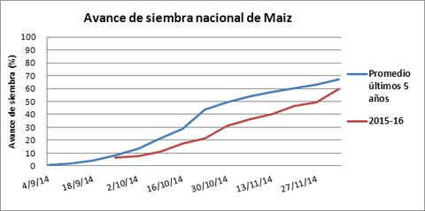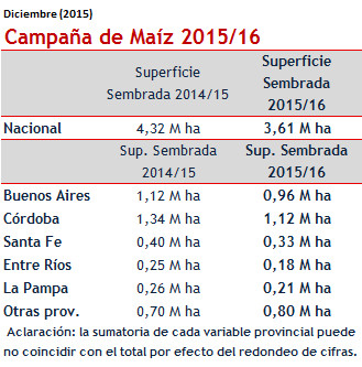 Con 60% de la superficie de intención ya implantada, se mantiene la estimación para la superficie sembrada de maíz 2015/16 en 3,6 millones de ha. Subsiste la posibilidad de ajustes posteriores en la medida que avancen las labores de siembra de diciembre dado que hay buenas posibilidades de sumar más hectáreas de maíces tardíos y sobre todo de segunda. De todas formas, de confirmarse este guarismo como cifra final, la caída en la superficie sería de un 16% respecto de su ciclo anterior.