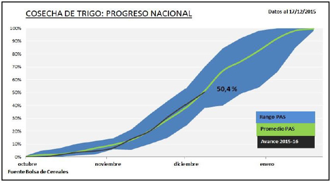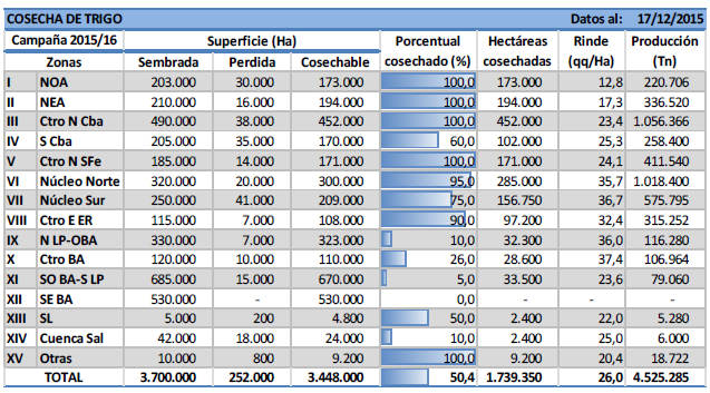 En el Centro-Norte de Córdoba, los rindes se ubicaron entre los 20 qq/Ha y 26 qq/ha, logrando una media de 23,4 qq/Ha, restando solo la recolección de lotes puntuales que se encuentran con problemas de anegamiento que dificultan el avance de las máquinas. Rendimientos similares se obtuvieron en el Centro-Norte de Santa Fe, donde los mismos oscilaron entre los 21 y 27 qq/ha, alcanzando un promedio final de 24,1 qq/Ha y una producción aproximada de 400 mTn. Sobre el Sur de Córdoba, la caída de granizo ocurrida semanas atrás provocaron pérdidas en lotes de trigo que se encontraban próximos a cosecha, y en consecuencia se relevaron rendimientos muy dispares que se ubican entre 20 y 36 qq/Ha, dependiendo del nivel de daño.