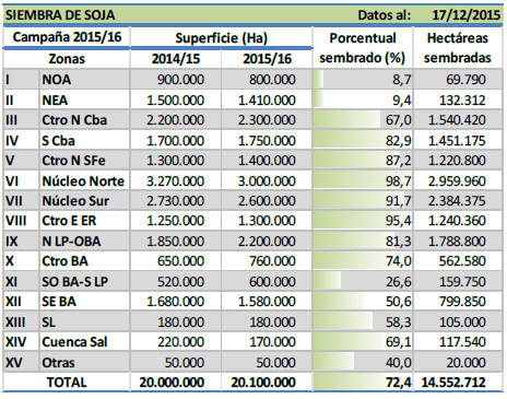 Durante las últimas semanas comenzamos a registrar posibles recuperaciones de áreas, en lotes que inicialmente iban a quedar afuera del circuito agrícola durante la campaña en curso. Dado el cambio de escenario actual, parte de esta superficie sería sembrada con soja durante los próximos días en las provincias del norte y en sectores marginales del oeste de la región agrícola, promovidas a su vez por la buena oferta hídrica actual. Pero esta expansión de la superficie destinada al cultivo de soja a su vez se encuentra sesgada por una recuperación en la intensión de siembra de maíz tardío, tanto sobre cuadros que mantenían barbechos abiertos, como también sobre rastrojos de trigos y cebadas recientemente cosechados en diferentes regiones del centro de la región agrícola. Sumado a ello, abundantes precipitaciones registradas frecuentemente durante las últimas semanas agravaron la condición de excesos hídricos en diferentes sectores de la región Núcleo Norte y en menor medida, también en áreas puntuales del Núcleo Sur, reduciendo de esta forma la oferta de superficie que será implantada con cultivos de verano en el corto plazo. Dentro de este marco de situación la proyección de siembra de soja asciende a 20.100.000 hectáreas, cifra que permite calcular un incremento de 300.000 hectáreas en comparación a nuestra proyección inicial (19,8 MHa proyectadas desde el 19-Oct-2015 hasta nuestro informe previo) y a su vez reflejando un leve incremento interanual de 0,5 % (siembra 2014/15: 20.000.000 Ha).