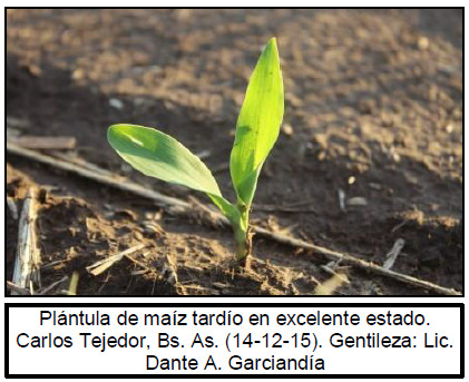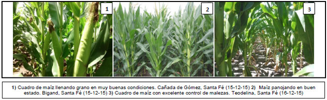 En el sur del área agrícola nacional comenzó el tramo final para la incorporación de lotes tardíos y de segunda ocupación. Hacia las zonas del Sudeste y Sudoeste de Bs. As.-Sur de La Pampa los cuadros ya transitan estadíos entre V7 y V9. Al presente informe todavía se registran deficiencias hídricas en el Sudeste de Bs. As., en particular en las localidades de Tres Arroyos, Necochea y San Cayetano. Sobre las zonas del Centro de Bs. As. y Norte de La Pampa-Oeste de Bs. As., continua la incorporación de lotes tardíos a buen ritmo. Los cuadros implantados temprano ya se encuentran iniciando la etapa de panojamiento en buen estado.