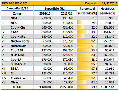Durante la última semana continuó la incorporación de cuadros de maíz con destino grano comercial correspondiente a la campaña 2015/16 en todo el país. Las labores de siembra se concentraron en el centro y sur del área agrícola nacional. Las precipitaciones de las últimas semanas comenzaron a afectar parte de los cuadros implantados, ya que se generaron anegamientos temporarios en sectores bajos del relieve.