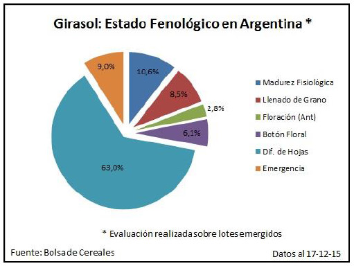 A su vez, en el Sudoeste de Buenos Aires-Sur de La Pampa, los cuadros de girasol se encuentran desarrollando entre 5 y 9 hojas (V5-V9), donde fuertes ataques de insectos del suelo en la localidad de Rivera obligaron a los productores a realizar aplicaciones en los días previos a esta publicación. En el Sudeste de Buenos Aires, la condición hídrica es escaza y se esperan precipitaciones en el corto plazo que permitan reponer humedad en superficie para lograr un buen desarrollo vegetativo de los cuadros, que actualmente se encuentran diferenciando hojas (V4-V8). En cuanto a la sanidad, se relevó presencia de bicho bolita en cuadros puntuales de la localidad de San Manuel.