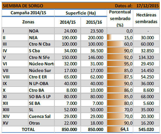 Continúan las tareas de cobertura con sorgo granífero destino grano comercial. A la fecha se llevan implantadas 545.000 Ha las cuales representan un 64,1 % de la superficie nacional, tentativamente estimada para esta campaña en 850.000 hectáreas. De esta forma el avance de siembra para los últimos 14 días es de 22,5 puntos porcentuales; este avance de gran magnitud se debe al buen clima y a que la siembra de soja, prioritaria para los productores, se encuentra en su fase final. La región del NOA, continúa a la espera de que las lluvias provean humedad para comenzar la siembra.