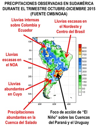 El verano 2016 observará un lento debilitamiento de “El Niño”, que conservará un elevado vigor a lo largo de toda la estación. Si bien al inicio de la temporada se supuso que, por ser un episodio temprano, su disipación sería igualmente temprana, es de temer que su accionar se extienda durante todo el verano, llegando hasta mediados del invierno próximo, y completando su disipación recién hacia el final de esa estación.