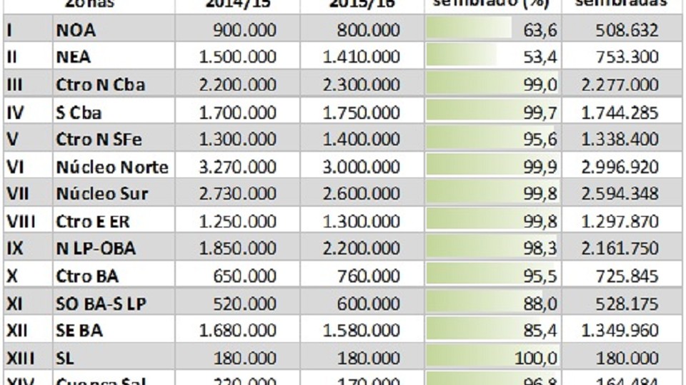 Durante las últimas semanas continuó la incorporación de cuadros de maíz con destino grano comercial correspondiente a la campaña 2015/16 en todo el territorio nacional. Las labores de siembra se concentraron en el norte del área agrícola nacional. Las últimas precipitaciones registradas en las regiones del NOA y NEA permitieron recuperar las reservas hídricas de los perfiles. Este escenario se da en el comienzo de la ventana de siembra del cereal en estas regiones, por lo cual, se continúa relevando una posible mejora en la intención de siembra de lotes tardíos y de segunda ocupación. Frente a este panorama mantenemos nuestra proyección de siembra en 2.850.000 hectáreas para la campaña 2015/16, un -16 % en comparación al ciclo previo (Campaña 2014/15: 3,4 MHa). Sobre esta estimación de superficie el avance de siembra cubrió a la fecha el 83,3 % del área, en números absolutos unas 2,4 MHa.