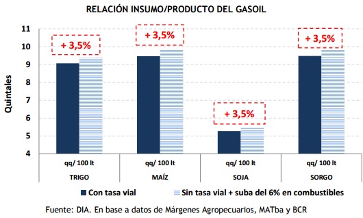No obstante, el anuncio de incremento en el precio de los combustibles en las próximas semanas implicará un deterioro del 3,5% en la relación insumo/producto de todos los cultivos. Es decir que, para poder obtener la misma cantidad de gasoil, un productor deberá vender un 3,5% más de cada grano.