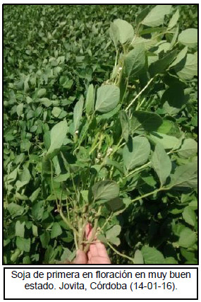 Al presente informe, la superficie implantada como soja de primera representa el 82 % de la actual estimación nacional de área y salvo en sectores puntuales, la evolución de estos lotes ha sido favorecida por una muy buena oferta hídrica. Según el resultado del relevamiento semanal, un 42 % de los cuadros de primera transitan etapas reproductivas de plena floración (R2) y poco menos de un 30 % ya se encuentra en etapas críticas de diferenciación de vainas (R3-R4). En paralelo, siembras de segunda aportan el 18 % de la superficie implantada a la fecha y un 90 % de esta superficie se encuentra diferenciando hojas o en menor medida aun transitando etapas de siembra/emergencia, en ambos caso la condición hídrica que predomina en estos lotes es favorable. Bajo este escenario la primera proyección de producción asciende a 58.000.000 de toneladas, que de concretarse reflejaría una merma interanual de -4,6 % en comparación al récord histórico de producción alcanzado durante la campaña previa (Producción 14/15: 60,8 MTn). Pese a esta caída interanual, explicada por excepcionales condiciones climáticas registradas durante el último ciclo, la actual proyección de producción supera en un 14,7 % al promedio de producción nacional de las cinco campañas precedentes (Promedio de Producción Nacional 2010/11 al 2014/15: 50,6 MTn). A su vez, es importante destacar que si bien la actual campaña se está desarrollando bajo condiciones favorables, aún falta transitar un largo camino hasta el momento de definición de rendimientos y posterior cosecha.