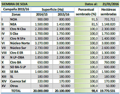 Durante los últimos siete días la siembra de soja registró un progreso de 1,9 puntos porcentuales, elevando el área cubierta al 98,4 % de una superficie proyectada en 20.100.000 hectáreas y sosteniendo un leve adelanto de 0,2 puntos en comparación al ciclo previo. Se da por finalizada la incorporación de lotes sobre el extremo sur de la región agrícola y la superficie remanente se reparte en su totalidad entre las regiones NOA y NEA, en donde la incorporación de cuadros culminaría durante los próximos días.