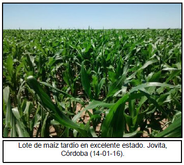 Sobre la provincia de Córdoba los maíces tardíos y de segunda ocupación se encuentran iniciando el proceso de panojamiento (VT) en buen estado. Por otro lado, los cuadros tempranos transitan estadios de llenado de granos. Aún se siguen registrando problemas por excesos hídricos en el sur provincial, generando clorosis en parte de los lotes. Hacia las regiones Núcleo Norte y Sur, los cuadros tempranos mantienen excelentes perspectivas en cuanto a los potenciales rendimientos. El estado de los lotes tardíos es bueno y se están realizando aplicaciones para controlar Spodoptera frugiperda.