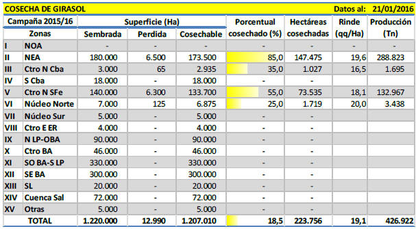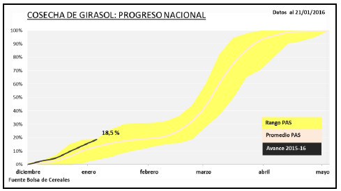 Durante la última semana la cosecha de girasol se concentró sobre el centro y norte del territorio nacional, particularmente en las regiones NEA, Centro-Norte de Santa Fe, Núcleo Norte y Centro-Norte de Córdoba. El progreso de trilla a nivel nacional se ubicó en el 18,5 % de la superficie apta. En números absolutos se logró recolectar más de 223 mil hectáreas, con un rinde medio nacional que ascendió a 19,1 qq/Ha y que permitió acumular un volumen parcial en chacra de 427 mTn. Por otro lado, se registró un progreso intersemanal de 4,4 puntos porcentuales y un adelanto en la cosecha en comparación al ciclo previo de 7 puntos. Bajo este escenario, mantenemos nuestra actual proyección de producción para la campaña en curso de 2.300.000 toneladas, cifra que refleja una variación interanual de - 8 % (Campaña 2014/15: 2,5 MTn).
