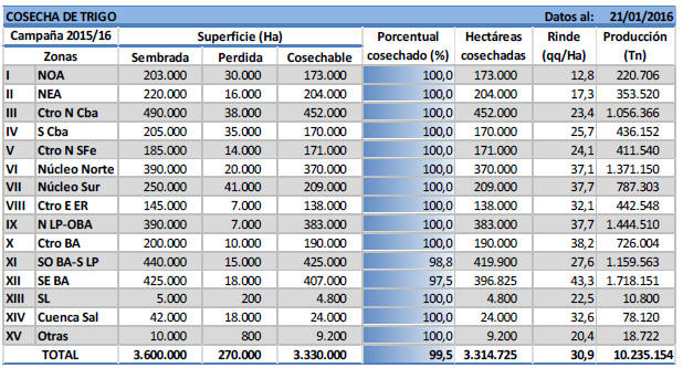 Para el caso de la región Sudeste de Buenos Aires, el avance acumulado de trilla es de 97,5 % reflejando un retraso en comparación al ciclo previo, en el cual la trilla había terminado hace ya una semana. En cuanto a los rendimientos cosechados, estos se ubican en torno a los 43,3 qq/Ha, un 15 % por encima de los registrados durante el ciclo previo (Rendimiento promedio Sudeste de Bs. As. Campaña 2014/15: 37,7 qq/Ha). Esta mejora en los rendimientos se debería a diferentes causas, entre las que se destacan la buena disponibilidad de humedad de los suelos durante gran parte del ciclo del cultivo, las temperaturas frescas durante las fases de llenado de grano y la baja presión de enfermedades registrada.