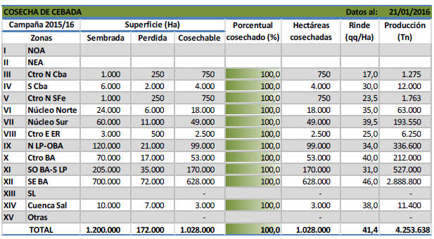 Gracias a la concentración de este cultivo en sectores bien delimitados, tomando como base lo ocurrido dentro de la provincia de Buenos Aires y el este de La Pampa podemos explicar más del 95 % de la producción nacional. Dentro de las diferentes zonas que componen esta superficie núcleo cebadera, los rendimientos se ubicaron por encima de los calculados al cierre del ciclo previo. Esta mejora en los rindes se debe a diferentes causas entre las que se destacan: la disponibilidad de humedad adecuada durante la mayor parte del ciclo del cultivo, la mayor incorporación de materiales genéticos de elevada productividad, el buen control que se realizó de enfermedades tales como mancha en red y ramularia, la temperatura fresca de primavera que favoreció un mejor llenado de grano y por último pero no menos importante, la posibilidad de trillar los cuadros de cebada sin problemas de vuelco u otras complicaciones.