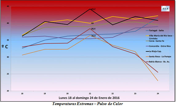 Las localidades mostradas presentaron, en su pico máximo temperaturas superiores a los 37 grados centígrados y en Tartagal se acusó una marca de 44,2 ºC, en Villa María del Río Seco 40 ºC y en Ceres 38,4 ºC. Estas temperaturas tan elevadas, producto de una excelente radiación solar, tienen por efecto aumentar las evapotranspiraciones quitando al suelo más agua líquida que lo normal y por lo tanto produciendo un efecto sobre los cultivos implantados que dependerá de la lluvia recibida y en definitiva de la humedad edáfica que queda en el perfil.