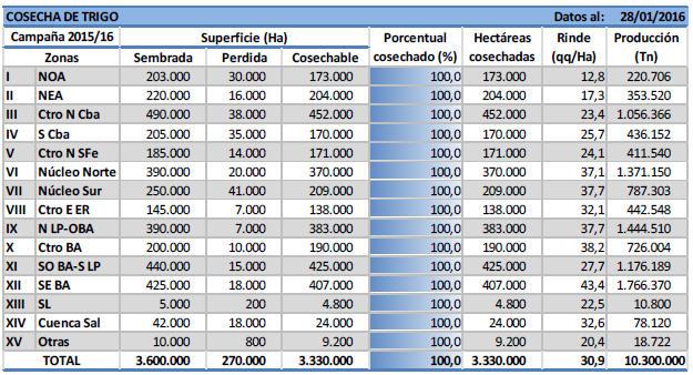 Al presente informe se da por finalizada la cosecha de trigo para la campaña 2015/16, alcanzando un volumen final de producción de 10.300.000 toneladas. Luego de recolectarse 3.330.000 de hectáreas, el rinde promedio nacional alcanzó los 30,9 qq/Ha, ubicándose 0,5 qq/Ha por encima del promedio nacional de las cinco campañas previas.