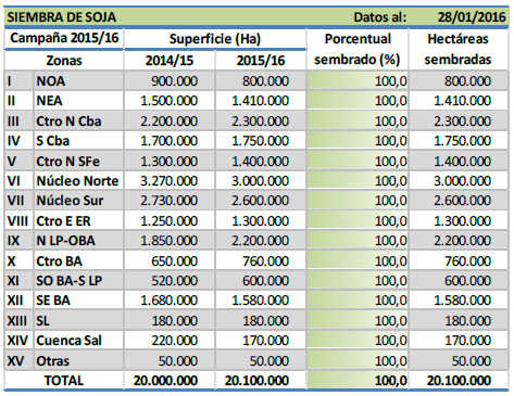 La incorporación de cuadros de soja ha finalizado en el norte del área agrícola nacional, más precisamente en las regiones NOA y NEA. Las elevadas temperaturas y la falta de precipitaciones abundantes sobre el NEA, dificultaron la siembra de los últimos cuadros por falta de humedad superficial. Los lotes implantados con anterioridad en esta región se encuentran diferenciando hojas en condiciones dispares. Sobre el NOA la presencia del déficit hídrico se observó en sectores aislados al sur de la región.