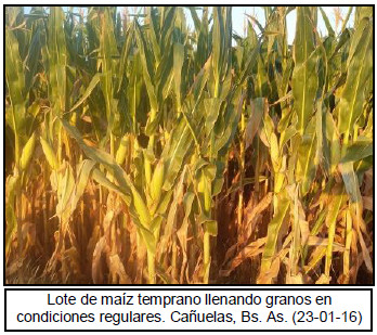 Hacia las regiones Núcleo Norte y Sur, los cuadros tempranos transitan el llenado de granos bajo condiciones heterogéneas. Se relevaron condiciones hídricas que van desde reservas buenas hasta escasas, particularmente hacia el norte de Bs. As. Estos sectores requerirán precipitaciones en las próximas semanas a fin de mejorar la situación de los cuadros. Sobre la provincia de Córdoba los maíces tardíos y de segunda ocupación se encuentran iniciando el período de definición de rendimiento en buen estado. Aunque en el sur provincial, aún se relevan cuadros con problemas de napas altas. Por otro lado, los cuadros tempranos se encuentran llenando granos con buenos potenciales de rendimientos.