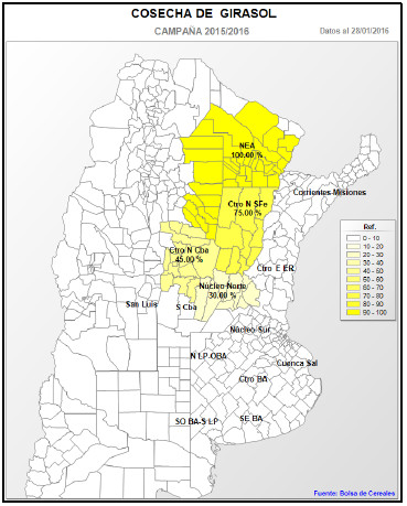Por otra parte, las cosechadoras lograron finalizar con las labores de recolección en los últimos lotes que restaban sobre el núcleo girasolero del NEA. En esta región, se acumuló un volumen cercano a las 336 mTn, con un rinde medio de 19,5 qq/Ha, el cual superó las expectativas iniciales y se ubicó levemente por encima del rendimiento registrado en el ciclo previo (Rendimiento NEA 2014/15: 19 qq/Ha). A su vez, la cosecha presentó un adelanto interanual de 5 puntos porcentuales, producto de las condiciones climáticas favorables que se registraron en las últimas semanas, con registro de elevadas temperaturas que favorecieron el secado de los cuadros de forma anticipada. En cambio, sobre el Centro-Norte de Santa Fe, pese a las precipitaciones de baja intensidad que se registraron en la última semana, la trilla continuó desarrollándose de manera normal donde el rinde medio regional ascendió a 18,8 qq/Ha. Si las condiciones climáticas continúan siendo favorables, no se descarta la posibilidad de que la recolección finalice en el transcurso de la próxima semana.