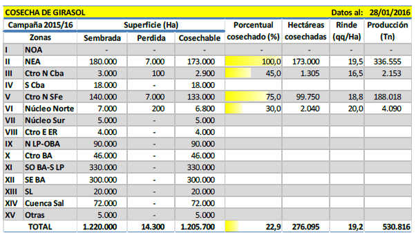 Durante los días previos a esta publicación, se dio por finalizada la cosecha de girasol en la región NEA, mientras que en el Centro-Norte de Córdoba y Santa Fe, y en el Núcleo Norte, las labores de trilla cobraron mayor fluidez sobre los cuadros que se encontraban en madurez fisiológica. El progreso de cosecha a nivel nacional alcanzó el 22,9 % de la superficie apta, permitiendo calcular un avance intersemanal de 4,4 puntos porcentuales y un adelanto en comparación al ciclo previo de 9,9 puntos. En números absolutos ya se han recolectado más de 275 mHA, donde el rinde medio nacional ascendió a 19,2 qq/Ha y permitió acumular un volumen parcial en chacra de 530 mTn. Bajo este escenario, mantenemos nuestra actual proyección de producción para la campaña en curso de 2.300.000 toneladas, cifra que refleja una variación interanual de - 8 % (Campaña 2014/15: 2,5 MTn).
