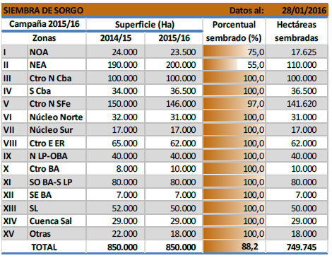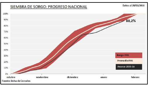 Continúan las labores de incorporación de sorgo con destino grano comercial y a la fecha ya se lleva implantado el 88,2 % de la superficie proyectada a nivel nacional, tentativamente estimada para esta campaña en 850.000 Ha. Este progreso refleja un avance quincenal de 9,2 puntos porcentuales y una variación interanual de -1,9 puntos. Se proyecta además que la siembra culminará en el correr de los próximos 14 días, de no mediar inconvenientes de índole climática.